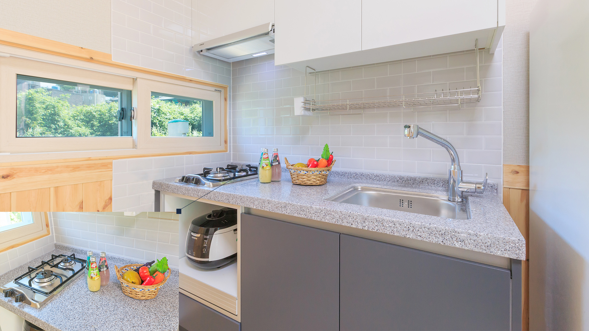 • · 구비시설 ·가스레인지 / 스텐드 에어컨(복층 벽걸이 에어컨) / 전기밥솥 / 선풍기 / TV / 냉장고 / 커피포트 / 세면도구 / 헤어드라이기 / 식기류일체